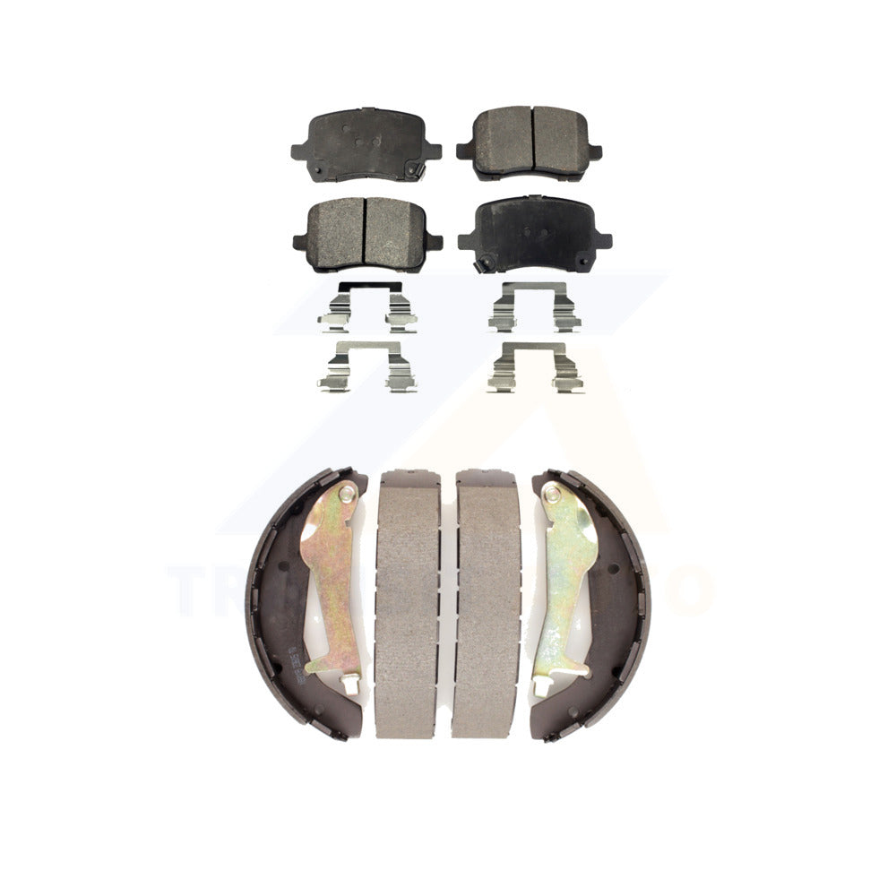 - INCLUDES: 1x Front Semi-Metallic Positive Plus Brake Pad Set (Hardware Included) + 1x Rear Top Quality Drum Brake Shoe Set