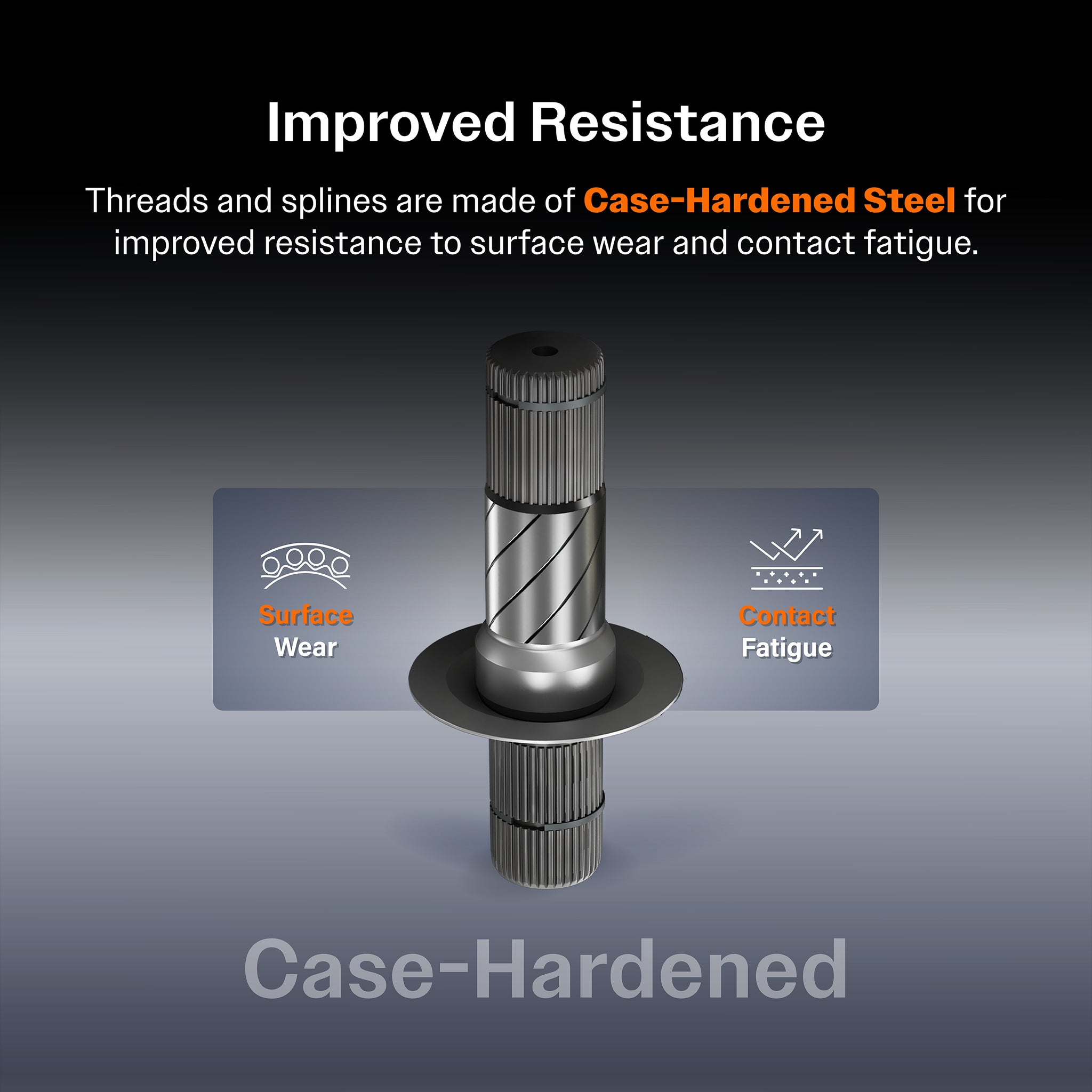 - Threads and splines are made of Case-Hardened Steel for improved resistance to surface wear and contact fatigue