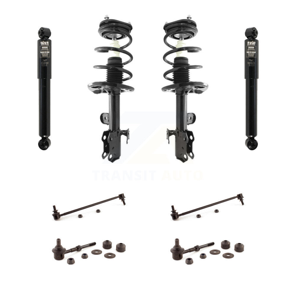 - Kit Includes: 2x Front Unity Automotive Suspension Strut and Coil Spring Assembly (Both Side) + 2x Front TOR Suspension Stabilizer Bar Link Kit (Both Side) + 2x Rear TMC Shock Absorber (Both Side) + 2x Rear TOR Suspension Stabilizer Bar Link Kit (Bot