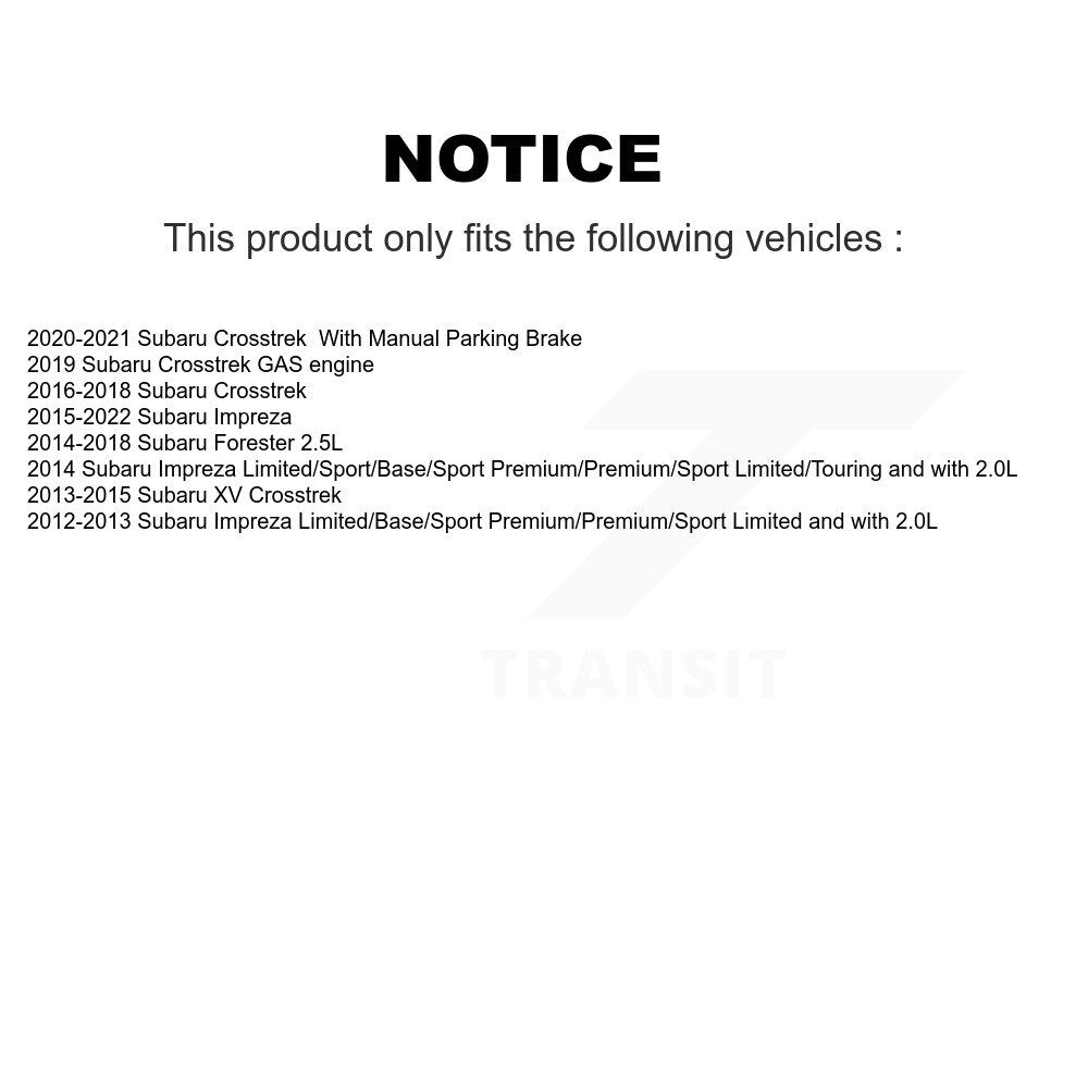 | 2020 | Subaru | Crosstrek | All | With Manual Parking Brake | All | All | All | All |