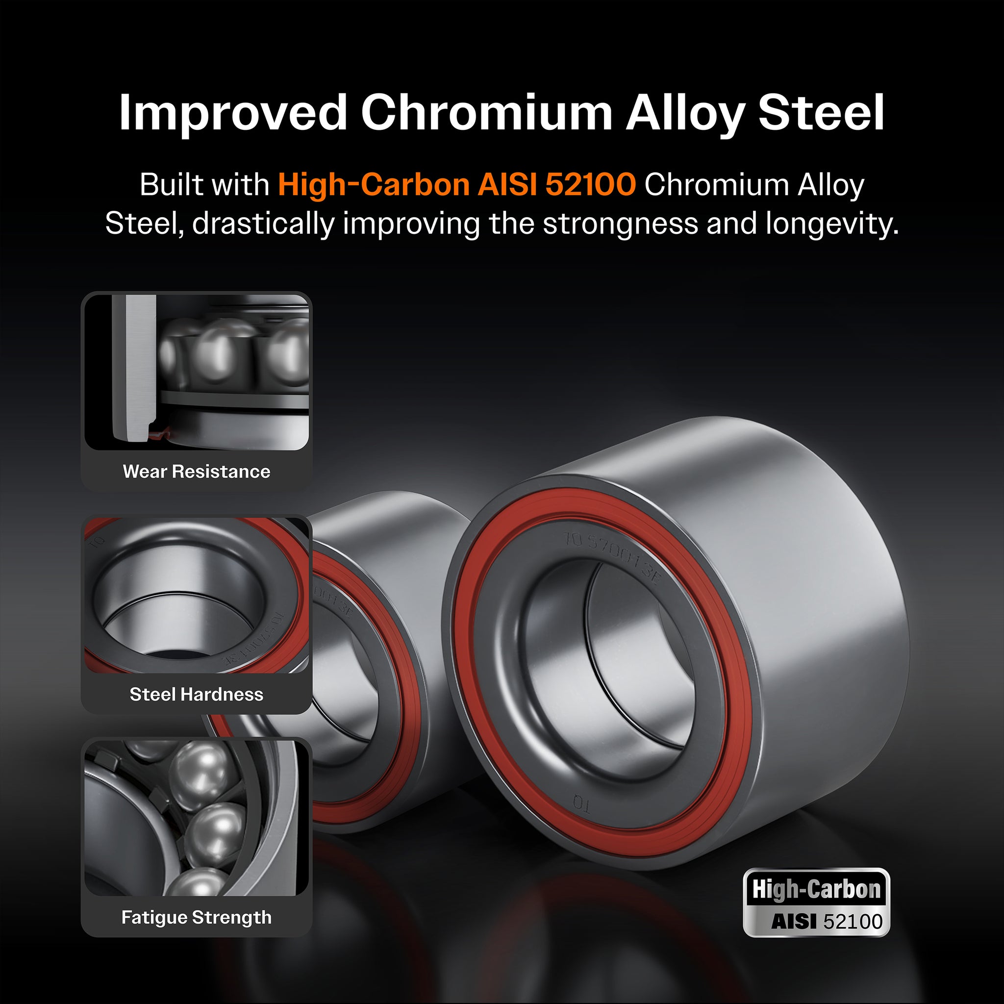 • Inner rings are made of AISI 52100 alloy (high carbon) steel, low-alloy chromium steel, which meets ASTM International quality standards